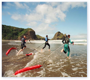 their beaches and drop them to the patient with rescue tube and fins.